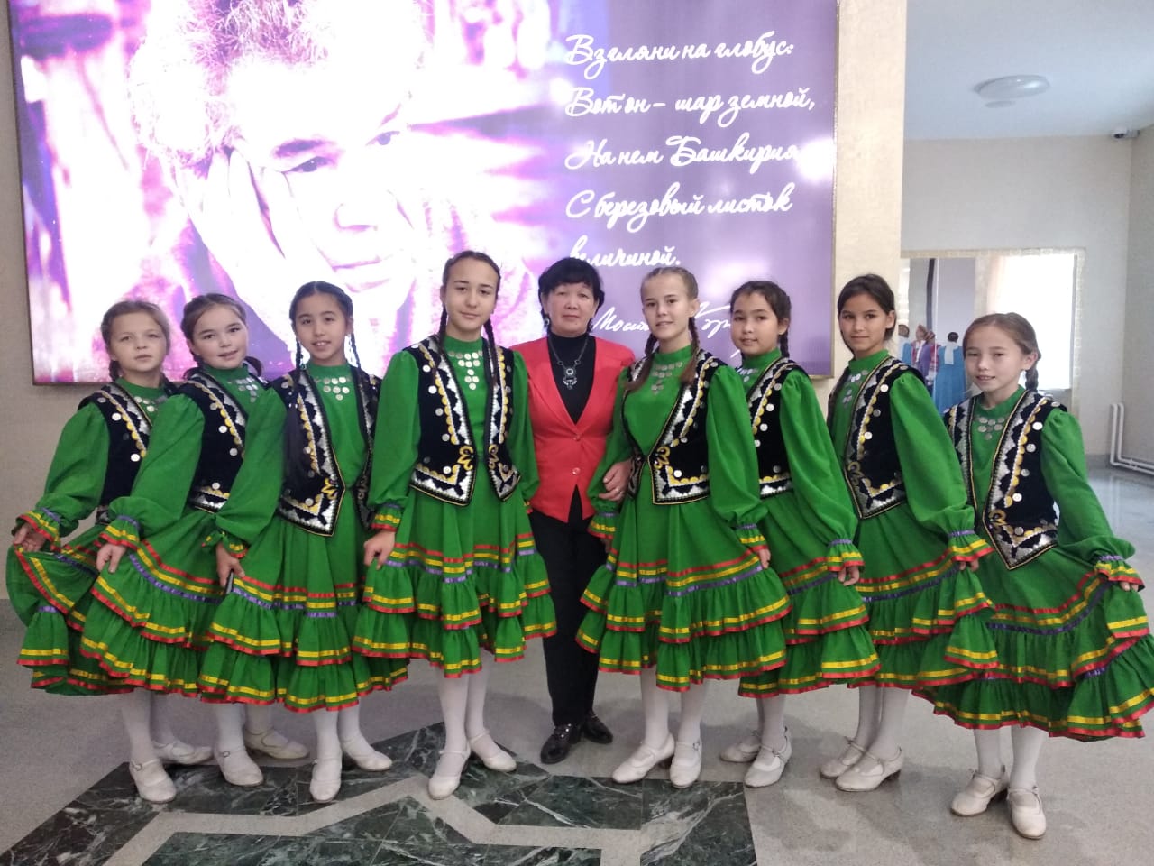 На фотографии учащиеся хореографического объединения Дома пионеров и школьников в башкирских костюмах.