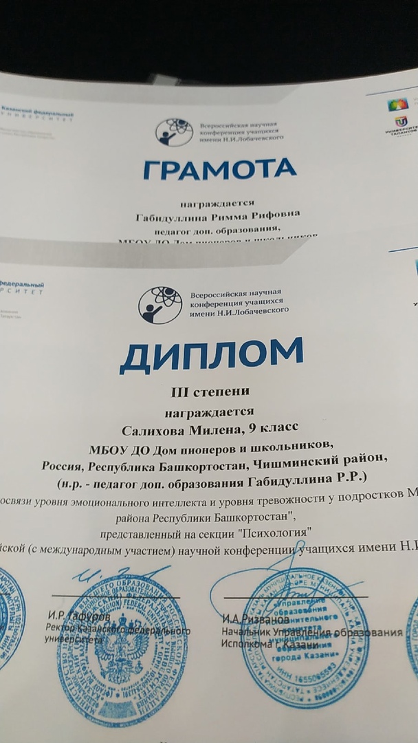 С 27 по 29 марта в Казанском Федеральном Университете прошел VI Всероссийский (с международным участием) конкурс исследовательских работ имени Н.И. Лобачевского. Учащаяся Психологического клуба "Инсайт" Салихова Милена стала дипломантом III степени в номинации "Психология" с работой "Связь уровня эмоционального интеллекта и уровня тревожности у подростков" (руководитель Габидуллина Р.Р.). Поздравляем и желаем дальнейших успехов!!!