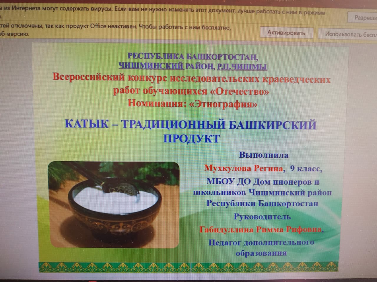 Поздравляем призера Всероссийского конкурса краеведческих работ "Отечество" Мухкулову Регину (руководитель Габидуллина Р.Р.). Она представила проект "Катык - традиционный башкирский продукт", который вызвал интерес членов жюри и участников конкурса. Желаем Регине дальнейших успехов и удачи!!!