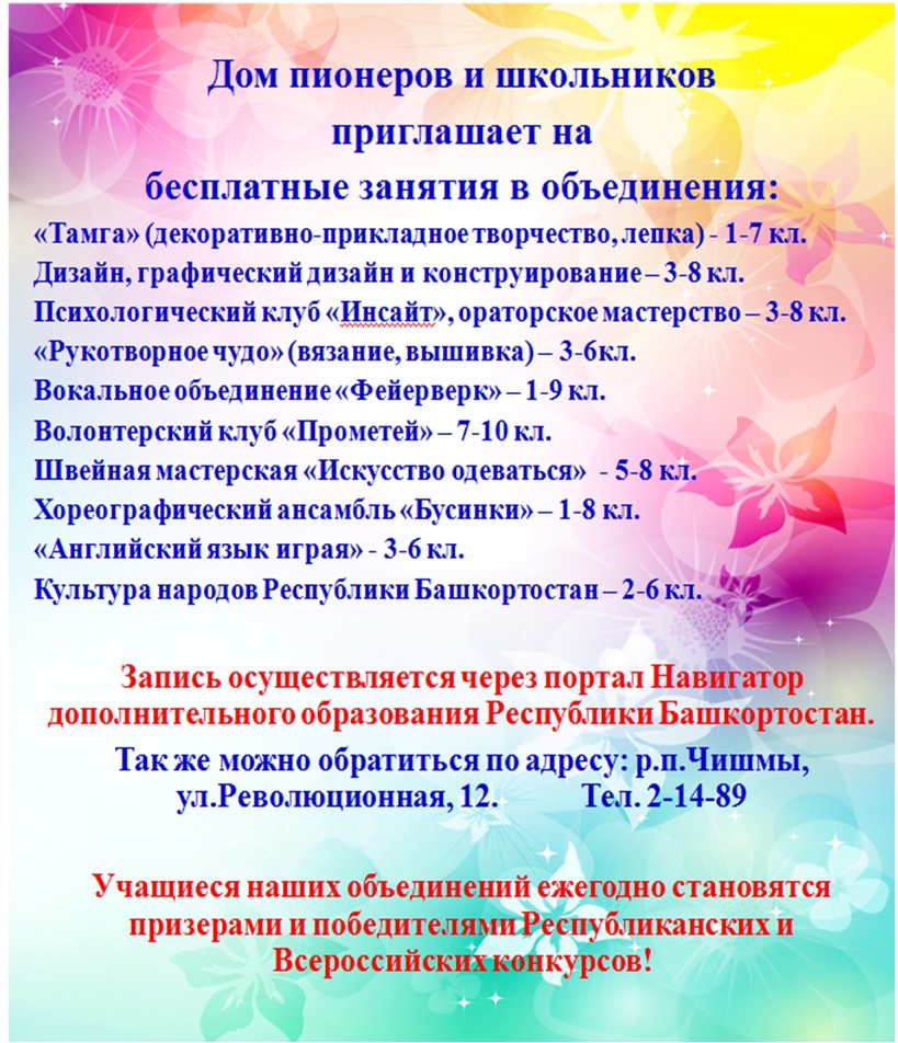 Уважаемые родители и ребята! Начинается набор в объединения Дома пионеров и школьников! Подавайте заявки с помощью портала Навигатор дополнительного образования Республики Башкортостан http://р02.навигатор.дети. Обращайте внимание на возраст детей, который указан в группах. Расписание будет корректироваться и меняться в зависимости от расписания в школах. В любом случае, вам будет предложен удобный для вас вариант. Ждём ваших заявок и напоминаем, что количество мест в группах ограничено!!!